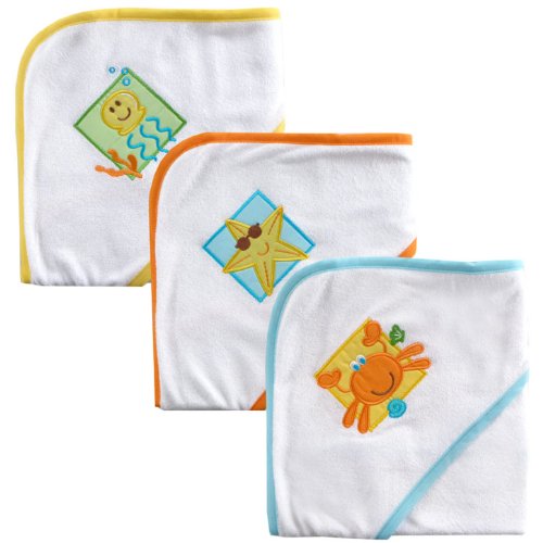 Luvable Friends hooded towels are made of cotton-rich absorbent knit terry to make drying your baby easy. The hooded design keeps your baby warm and cozy after bath. Comes in 3 colorfully stylish bath designs! (Boy: Ship, Shark & Whale || Girl: Snail, Fish & Octopus || Neutral: JellyFish, StarFish & Crab)